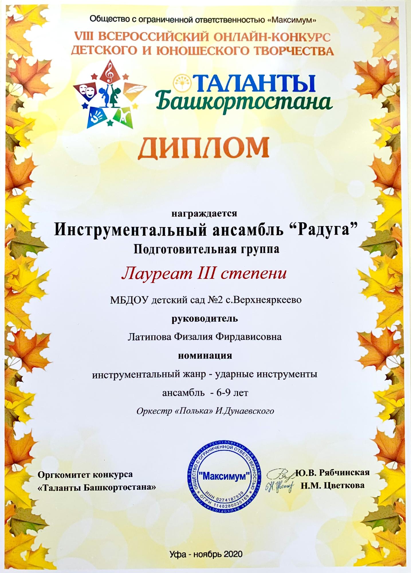 Всероссийский конкурс "Таланты Башкортостана" Лауреаты 3 степени Инструментальный ансамбль "Радуга"