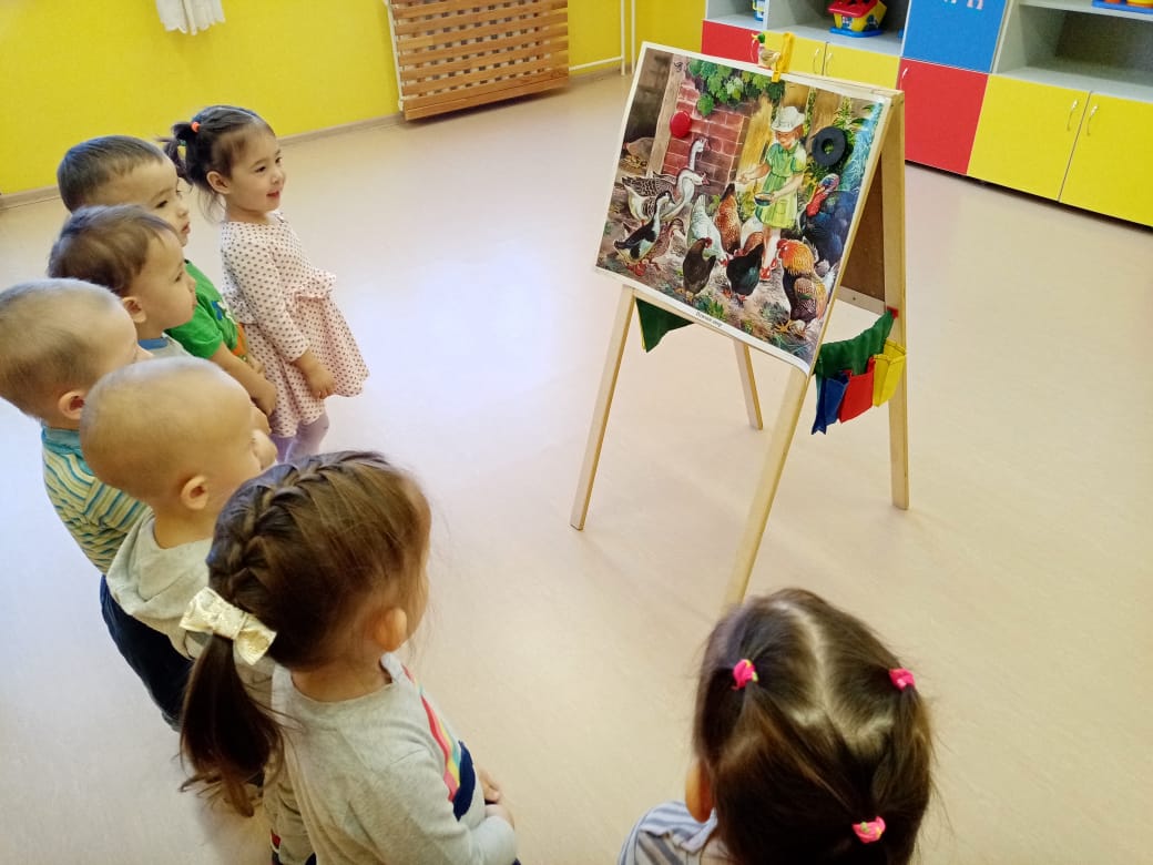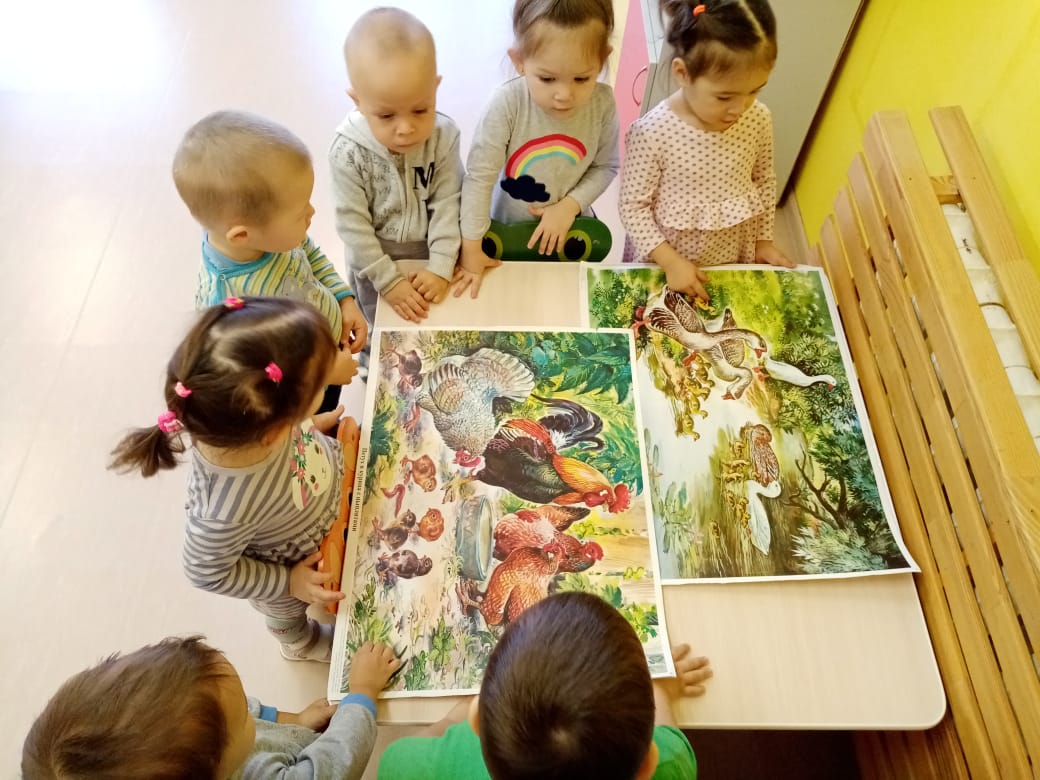 В группе раннего возраста 2, на занятии окружающего мира, с детьми проходили тему "Птичий двор". Дети рассматривали картинки, играли в дидактические игры "Чья мама?", "Чей малыш?", "Красивый хвост петуха". Провели игру-инсценировку "Вышла курочка гулять". Дети выполняли движения под музыку по показу воспитателя. Детям было весело, занимательно и увлекательно.