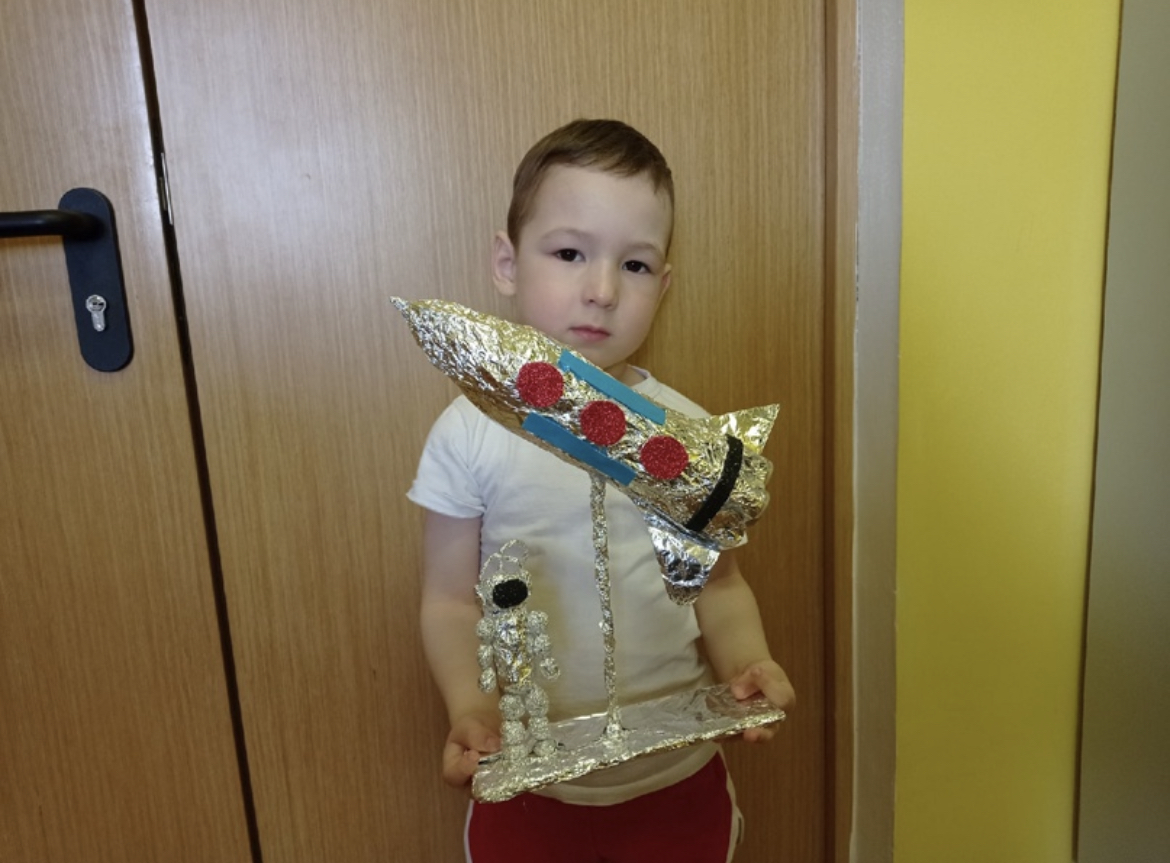Родители изготовили самые разнообразные поделки : это и ракеты и космонавты в скафандре или просто космическая галактика и ещё много чего. Поделки сделаны из различного материала: цветной картон, фольга, цветная бумага и т. д. Все работы сделаны родителями, совместно с детьми!