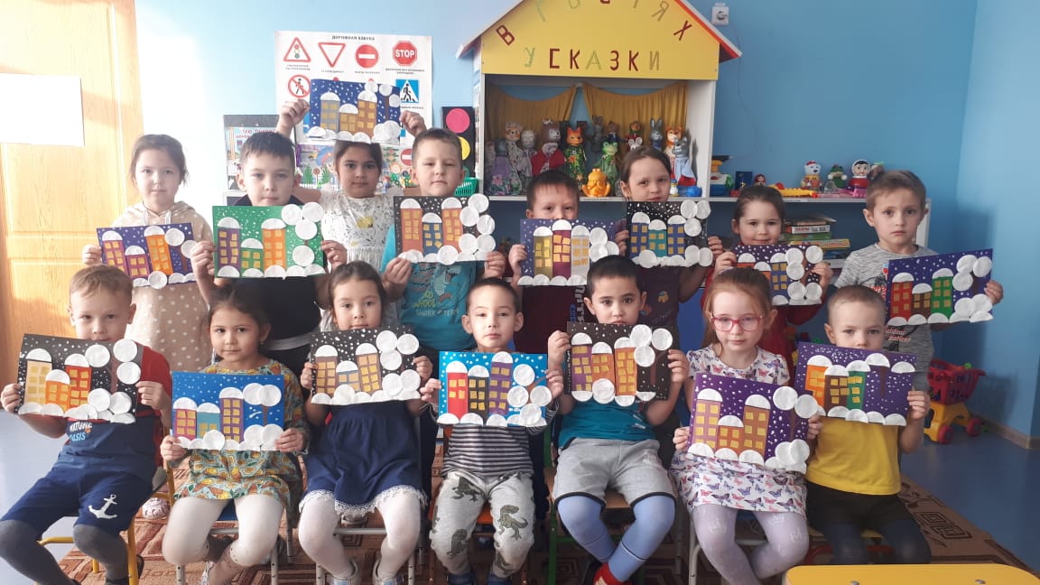 В подготовительной группе на занятии по познанию с воспитанниками сделали аппликацию на тему «Зима в городе».